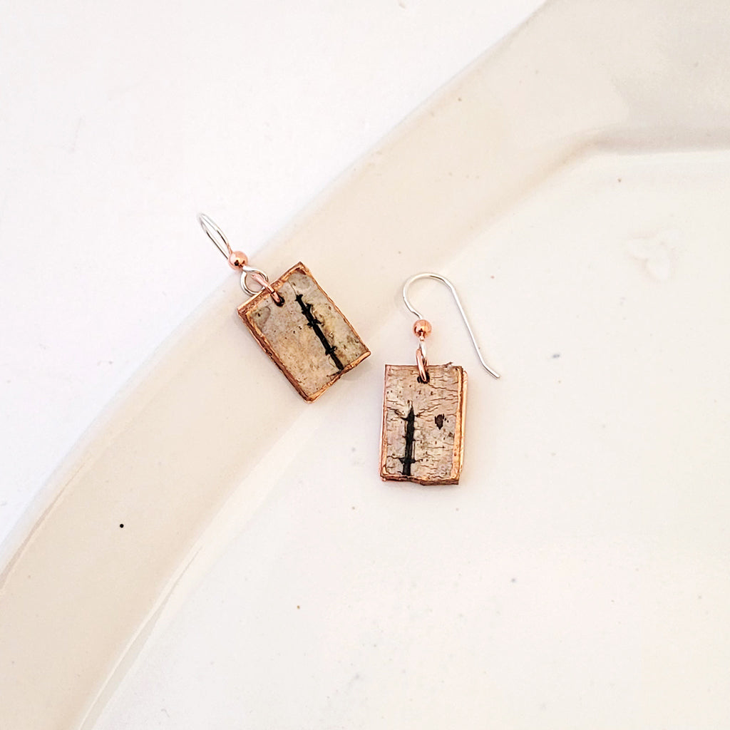Gathered Birch on Copper Rectangle - Handmade Earrings
