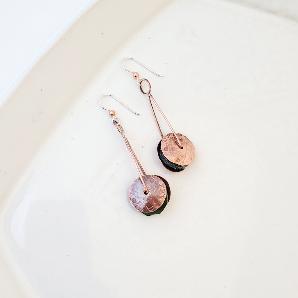 - Handmade, textured copper circles with slight curve, handmade copper loop