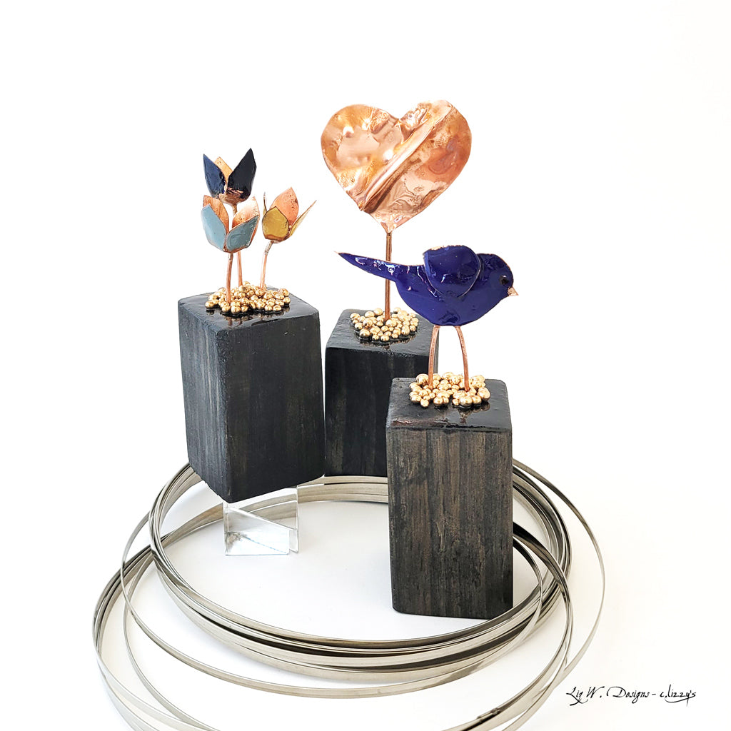 - Hand-fabricated mini copper birdie with cobalt blue enamel work, accented with bronze beads by copper legs