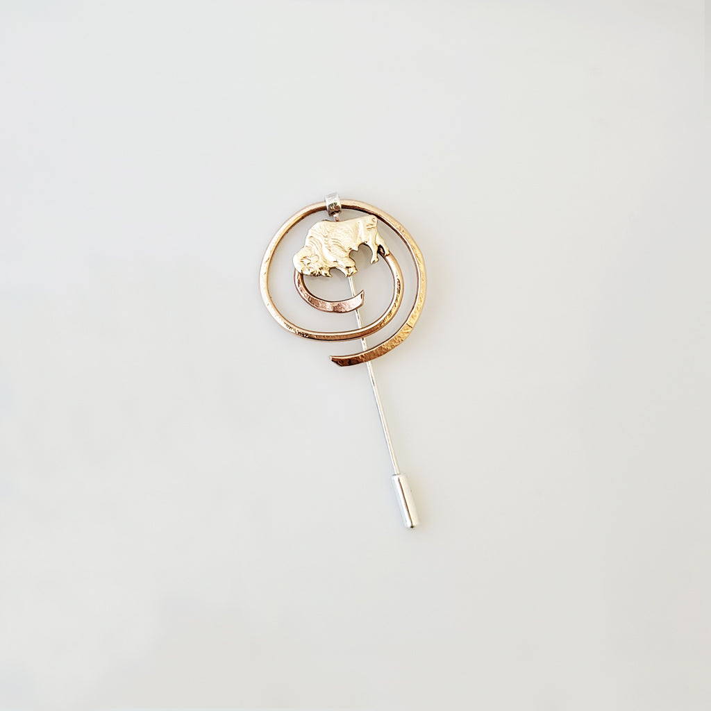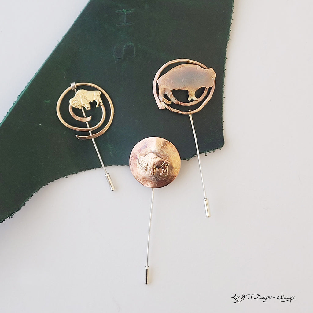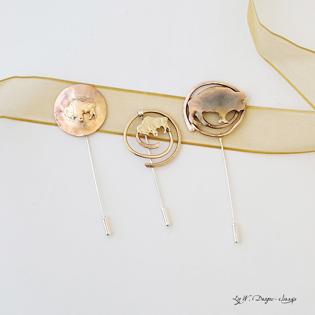 - Hand-fabricated bronze wire formed into a swirl circle design with texture, featuring brass bison